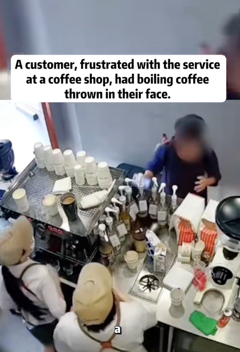 Screams filled the café as the victim stumbled back, clutching their face in pain while other patrons rushed to help. The customer suffered severe burns and was immediately taken to the hospital for treatment.