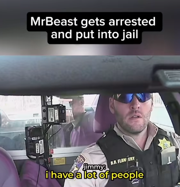 The footage, captured from what appears to be a police dashcam or bodycam, shows an officer driving with MrBeast sitting in the backseat. Text across the video claims, “MrBeast gets arrested and put into jail.” A captioned quote from Jimmy reads: “I have a lot of people.”